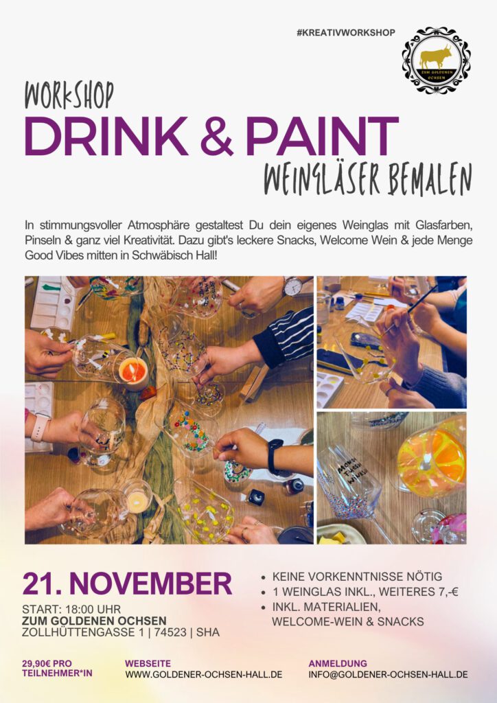 Am 21.11.25 kannst du an unserem Weingläser-Bemalen-Workshop im Goldenen Ochsen in Schwäbisch Hall teilnehmen.