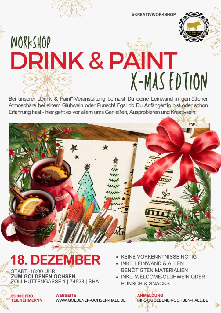 Lust auf einen kreativen Abend mit Freund*innen oder neuen Gesichtern? Bei unserer „Drink & Paint“-Veranstaltung erstellst du dein eigenes Kunstwerk in weihnachtlicher Atmosphäre und genießt dabei einen Glühwein oder Punsch aufs Haus!
